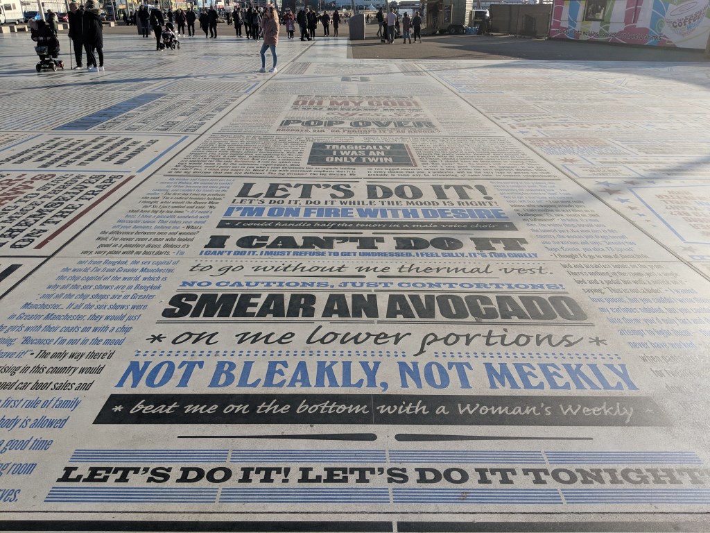 1. What an interesting collection of art. I’m intrigued by Blackpool’s Comedy Carpet and proud that I recognize at least one quote “Always look on the bright side of life ..” (Monty Python?) The other quotes “Smear an avocado” …ehm.